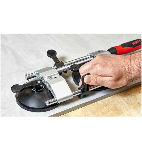 Zum Spannen von großflächigem, glattem Plattenmaterial. Besonders geeignet für stirnseitiges Verkleben von Polymerwerkstoffen, wie z. B. Corian, Varicor.