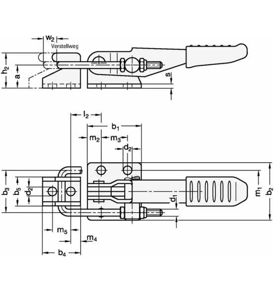 der Zugbügel kann innerhalb des Verstellweges justiert werden · in Spannstellung stehen Zugbügel und Spannarm parallel zur Befestigungsebene des Verschluss-Spanners Weitere technische Eigenschaften: · l2 min.: 19mm · a: 16mm · h2: 25mm · m1: 32mm · r: 57mm · m5: 14mm · b1: 40mm · m3: 19mm · l1: 152mm · b2: 44mm · b4: 28mm · h1: 30mm · d1: M 6mm · s: 3mm · m4: 7mm · d2: 6,5mm · b3: 32mm · m2: 10,5mm · b5: 22mm