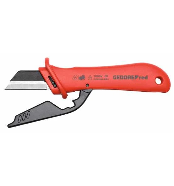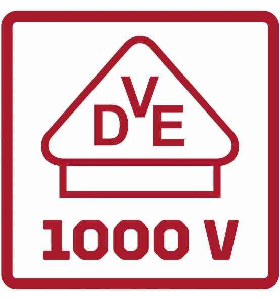 VDE-isoliert nach DIN EN 60900, Mit stabiler, teilisolierter und auswechselbarer Klinge, Gerade Schneide, Mit integrierter Schutzkappe, Sicherheitsgriff aus schlagfestem Kunststoff