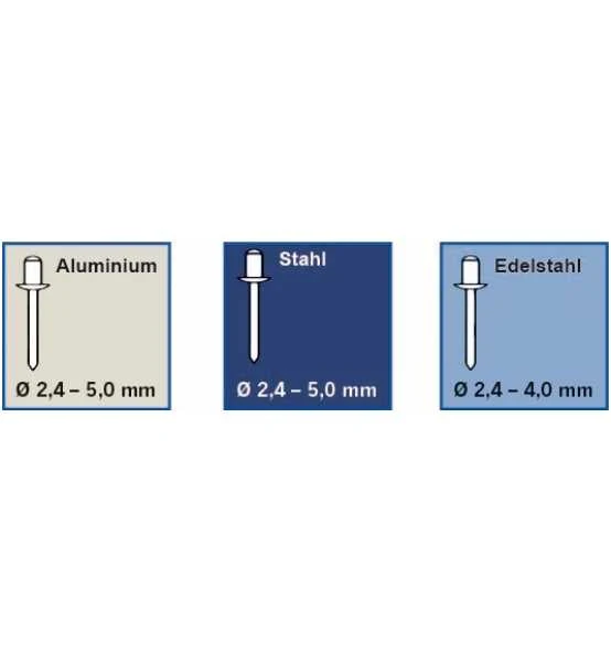 - Spannbacken aus gehärtetem Legierungsstahl für alle Blindniet-Materialien geeignet