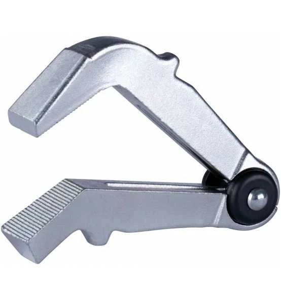 Schenkel aus hochfestem, legiertem Vergütungsstahl, verzinkt, mit Gelenkführung und verdeckter, unverlierbarer Rundstahlfeder. Backeninnenseite mit Querrillen. Mit schmalem Maul, 45° abgewinkelt. Zur Verwendung in Verbindung mit Schraubstock.